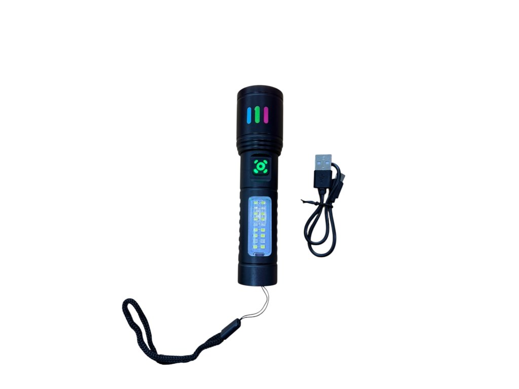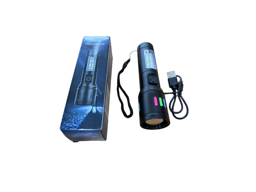Đèn làm từ hợp kim nhôm, chống mài mòn, chống trơn trượt, độ sáng cao. Tích hợp pin lithium, sạc bằng dây usb-A/usb-C. Chiếu sáng 2 kiểu là rọi thẳng và nhiều bóng sáng ở cạnh. Khi zoom thu nhỏ vòng sáng thì đèn có chiều dài 15cm.