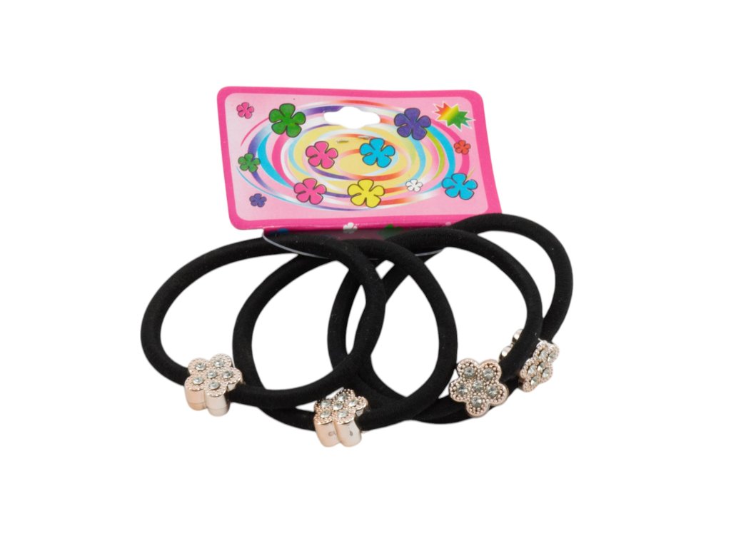 Dây buộc tóc mấu hoa đính đá vỉ giấy treo 4ks đen (bịch: 12 vỉ)