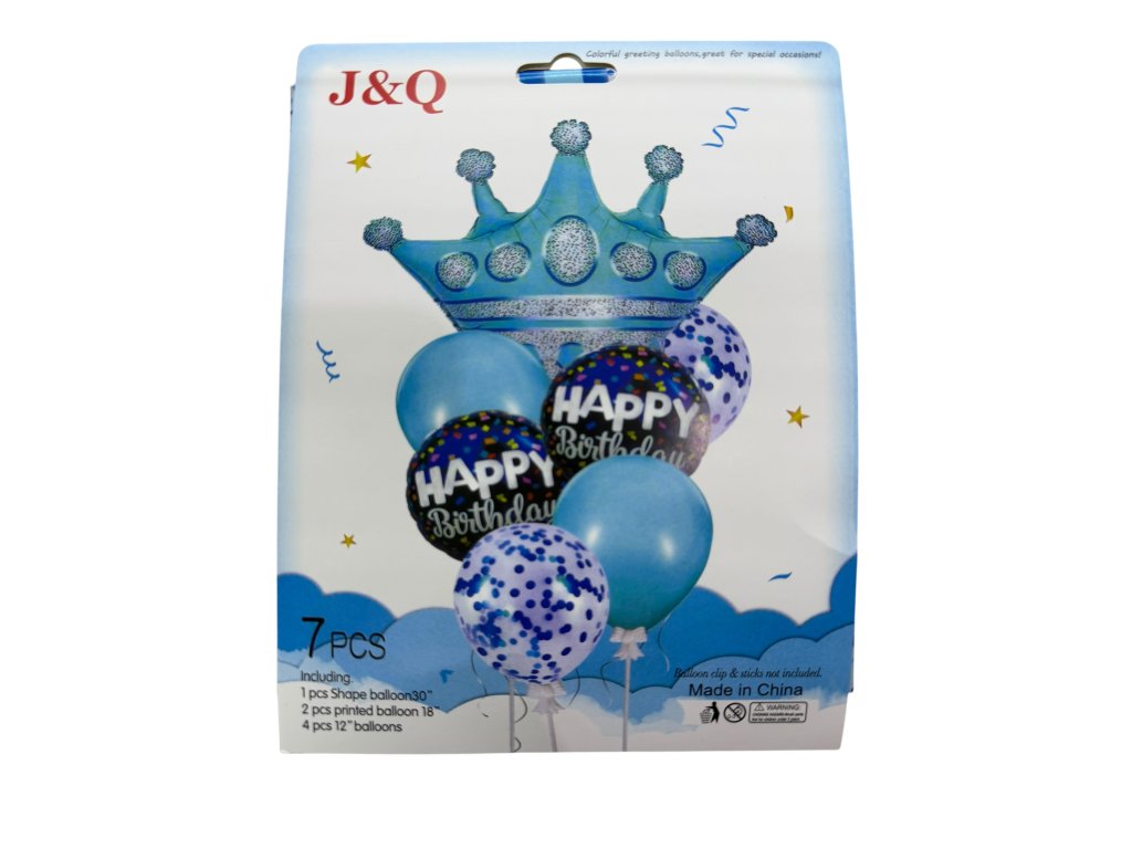 Set bóng trang trí gồm 7 bóng: 1 bóng hình vương miện dài 30inch = 76,2cm, 2 bóng in chữ dài 18 inch = 45,72cm, 4 bóng dài 12 inch = 30,48cm